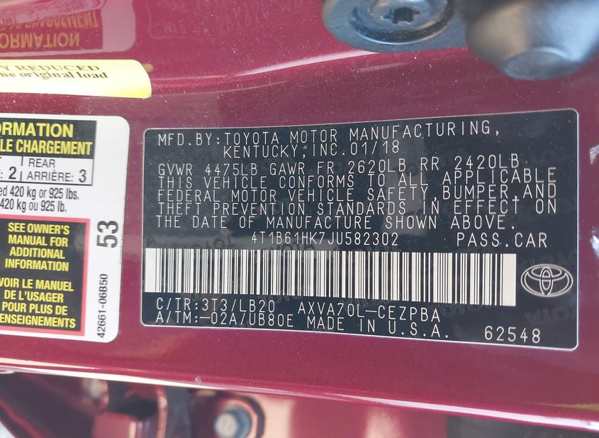 - VIN: 4T1B61HK7JU582302
