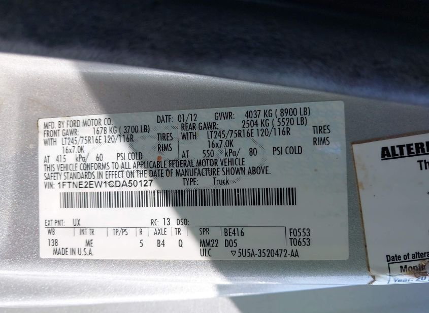 - VIN: 1FTNE2EW1CDA50127