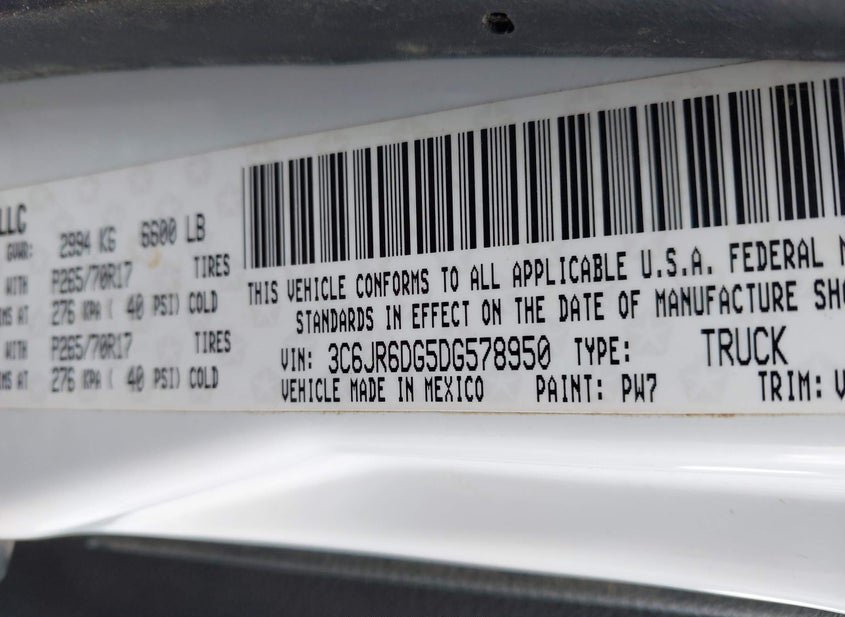 - VIN: 3C6JR6DG5DG578950