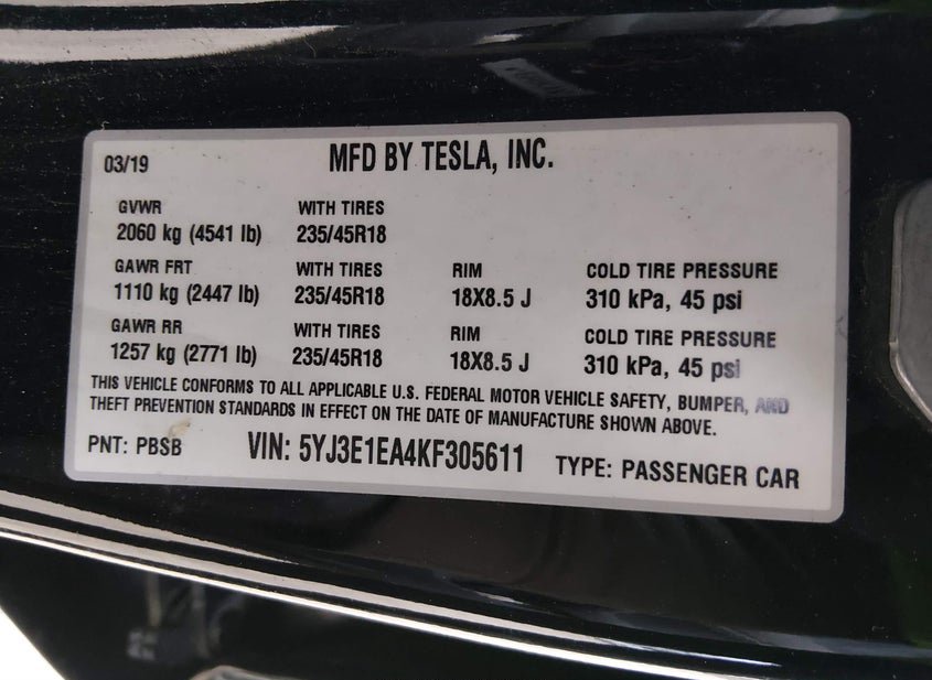 - VIN: 5YJ3E1EA4KF305611