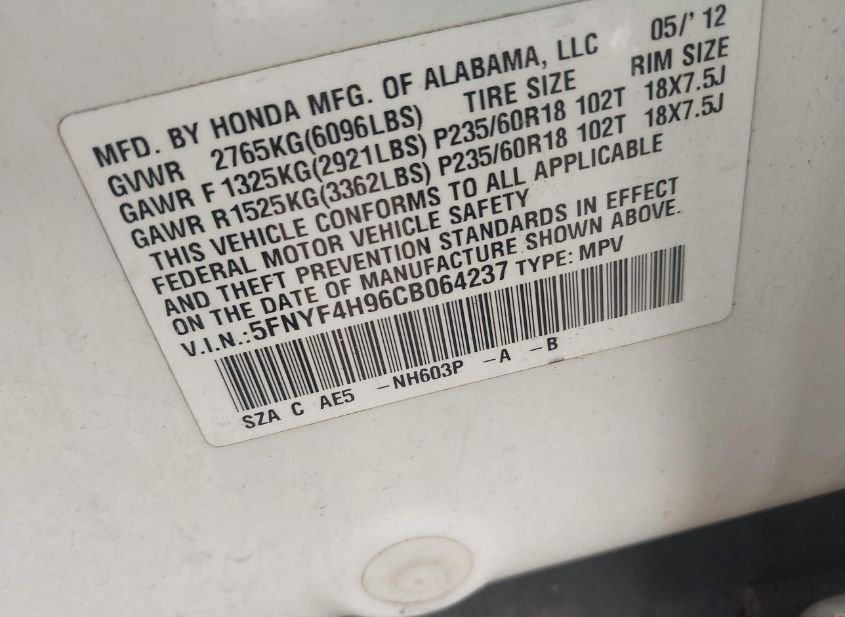 - VIN: 5FNYF4H96CB064237