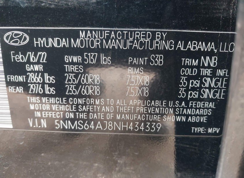 - VIN: 5NMS64AJ8NH434339