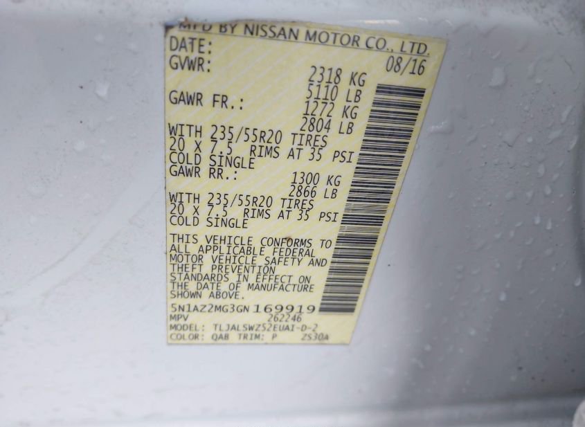 - VIN: 5N1AZ2MG3GN169919