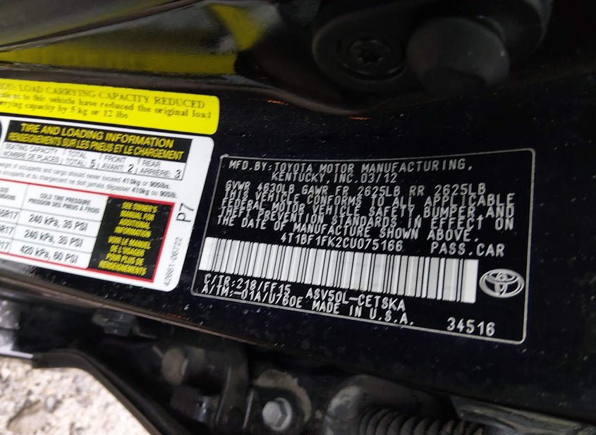 - VIN: 4T1BF1FK2CU075166