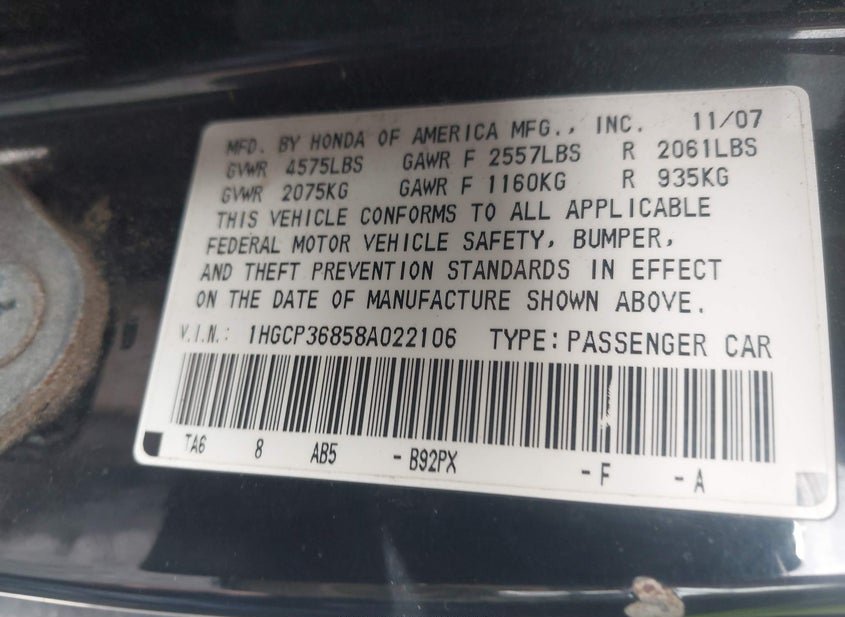 - VIN: 1HGCP36858A022106