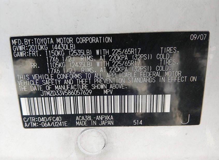 - VIN: JTMZD33V586057629