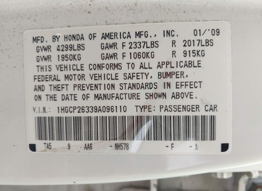 - VIN: 1HGCP26339A096110