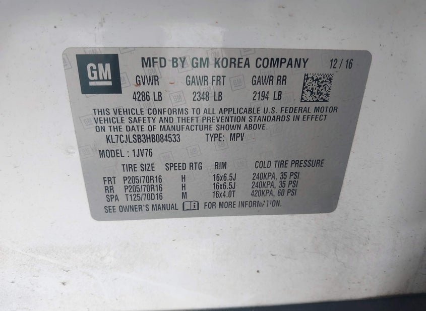 - VIN: KL7CJLSB3HB084533
