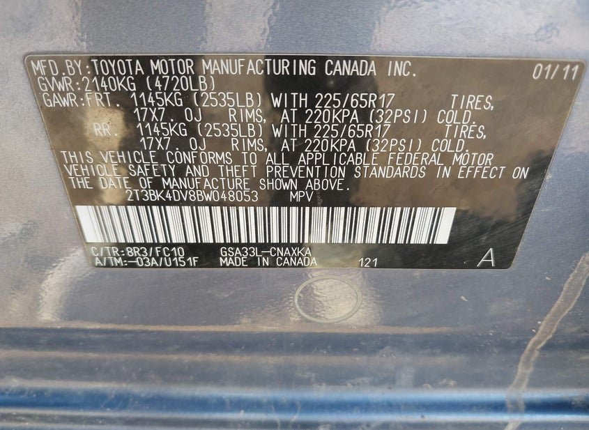- VIN: 2T3BK4DV8BW048053