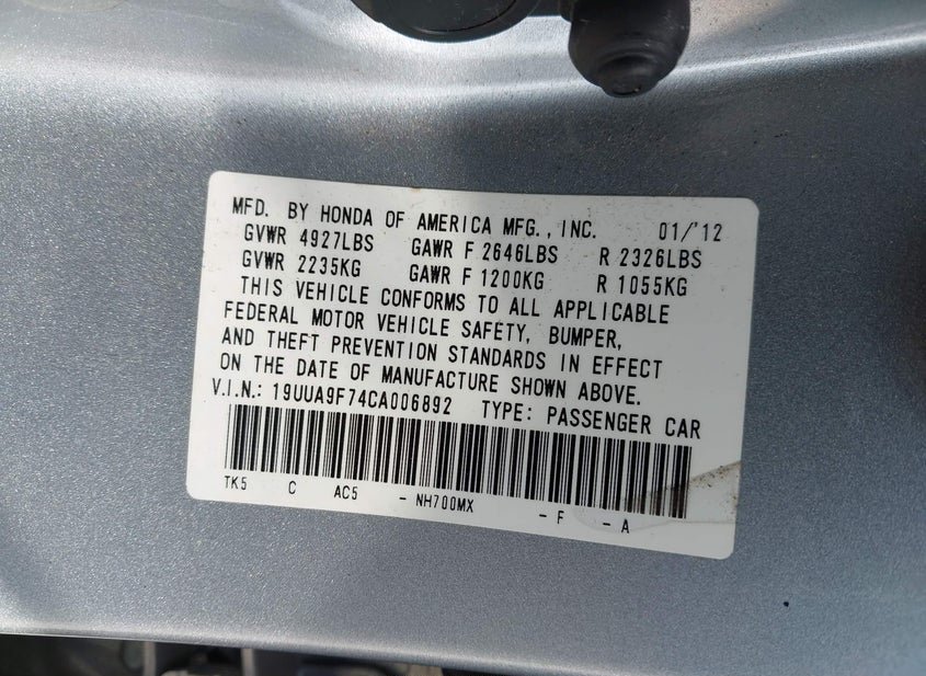 - VIN: 19UUA9F74CA006892