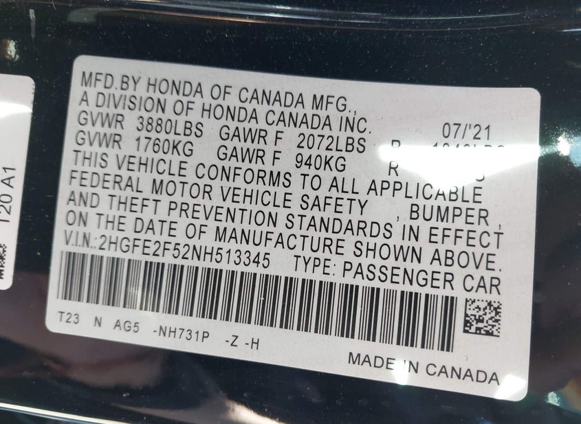 - VIN: 2HGFE2F52NH513345