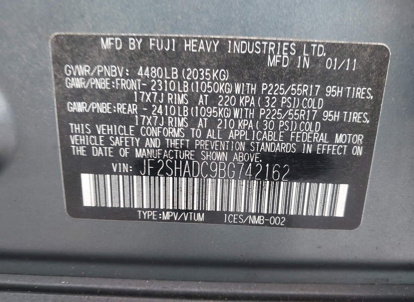 - VIN: JF2SHADC9BG742162