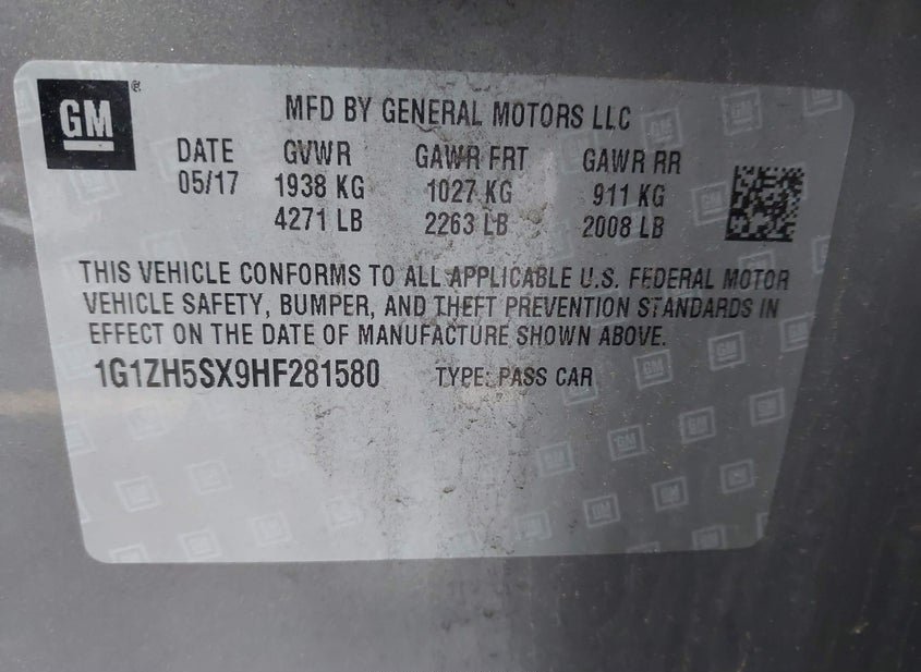 - VIN: 1G1ZH5SX9HF281580