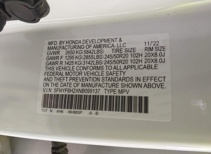 - VIN: 5FNYF6H2XNB099137