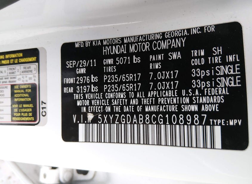 - VIN: 5XYZGDAB8CG108987