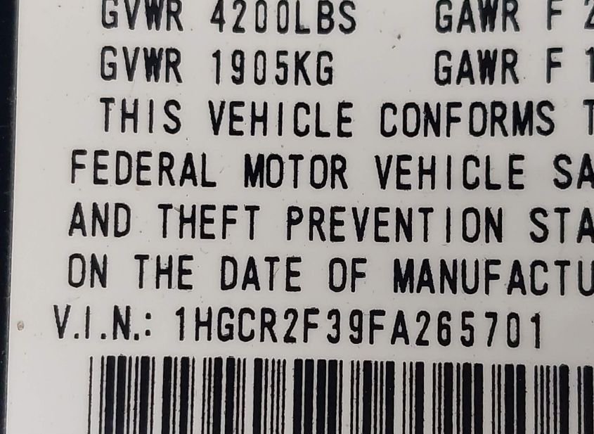 - VIN: 1HGCR2F39FA265701