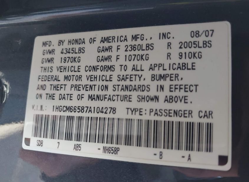 - VIN: 1HGCM66587A104278