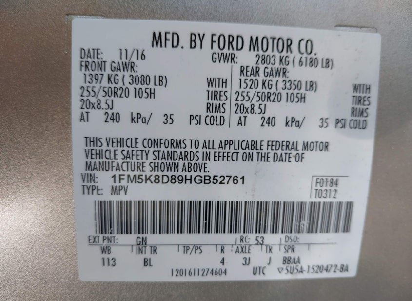 - VIN: 1FM5K8D89HGB52761