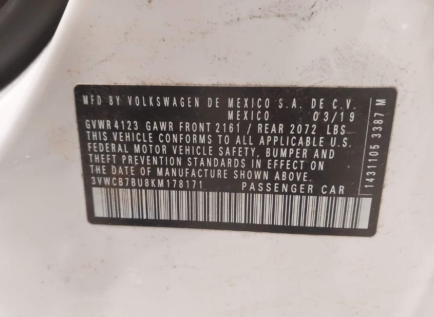 - VIN: 3VWCB7BU8KM178171
