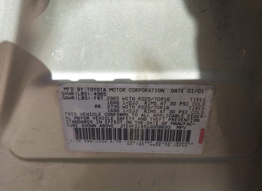 - Название лота: 2001 TOYOTA HIGHLANDER V6