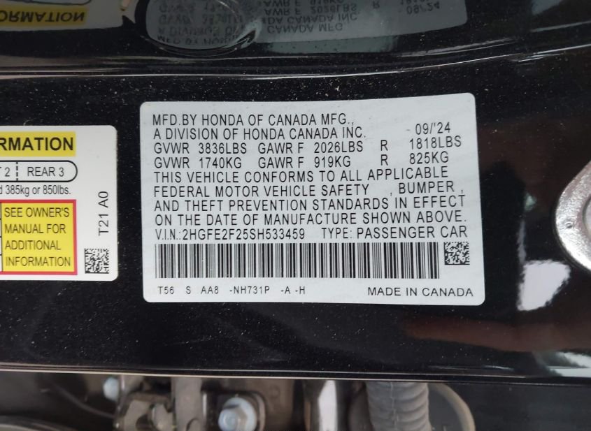 - VIN: 2HGFE2F25SH533459