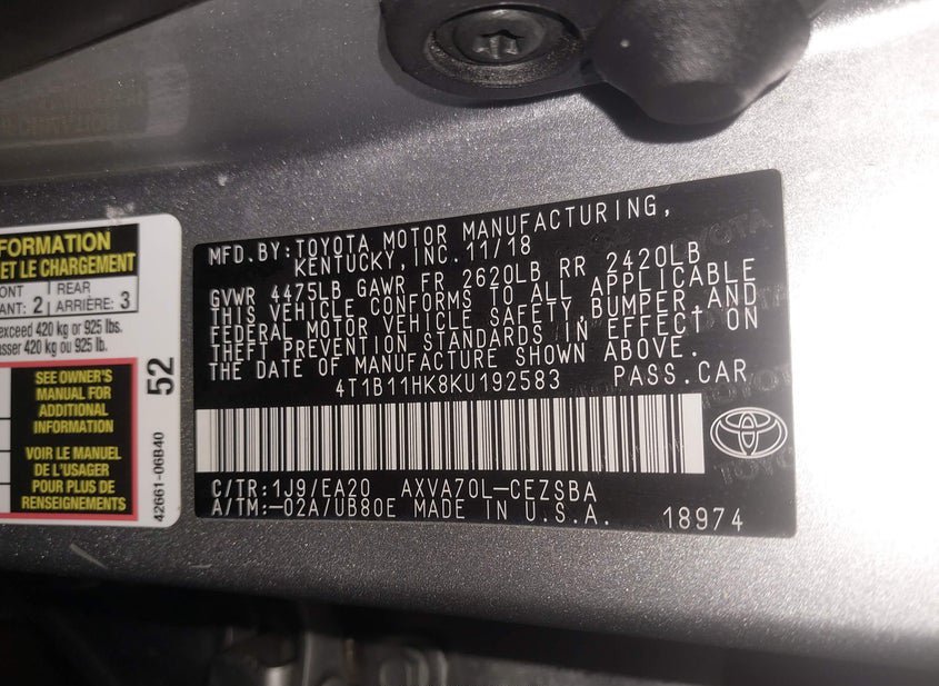 - VIN: 4T1B11HK8KU192583