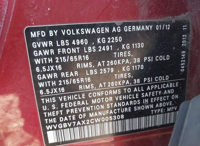 - VIN: WVGBV7AX2CW005308