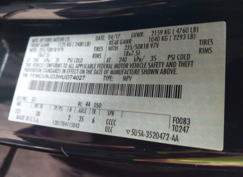 - VIN: 1FMCU9JD3HUD74027
