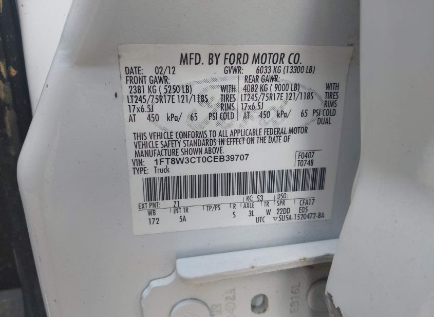 - VIN: 1FT8W3CT0CEB39707