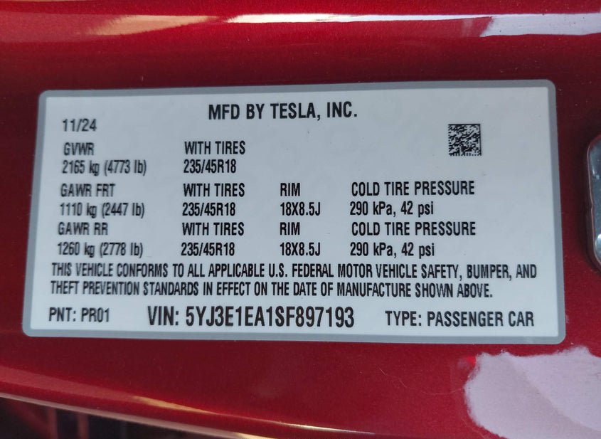 - VIN: 5YJ3E1EA1SF897193