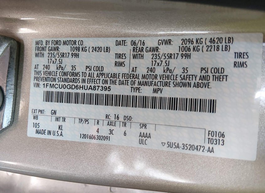 - VIN: 1FMCU0GD6HUA87395