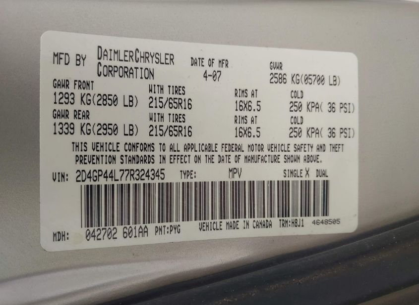 - VIN: 2D4GP44L77R324345