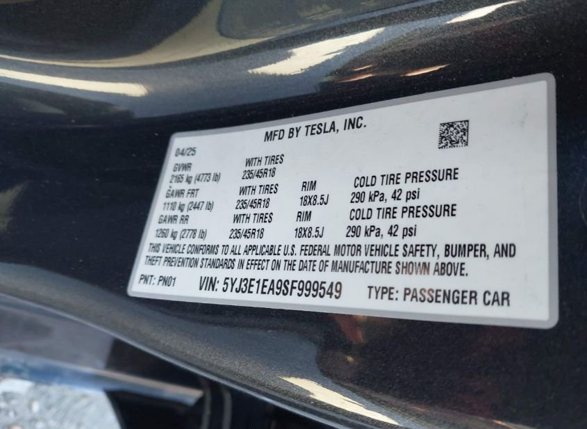 - VIN: 5YJ3E1EA9SF999549