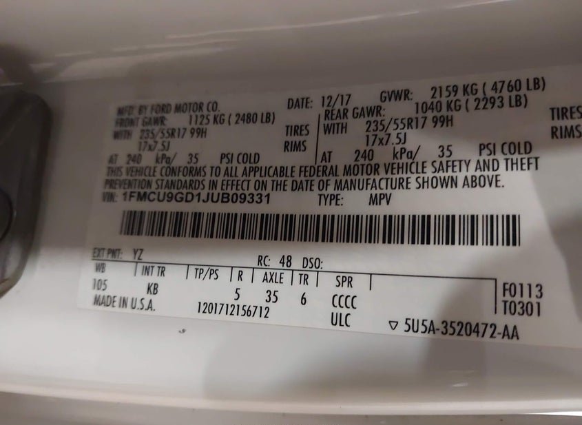 - VIN: 1FMCU9GD1JUB09331