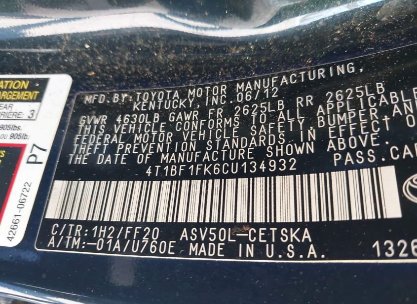 - VIN: 4T1BF1FK6CU134932