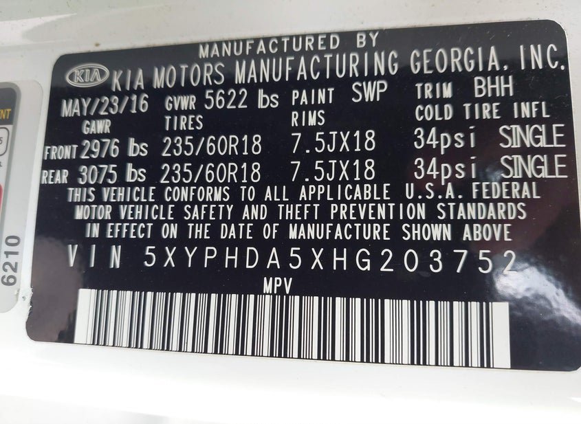 - VIN: 5XYPHDA5XHG203752