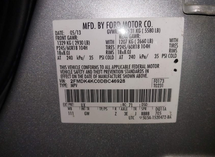 - VIN: 2FMDK4KC0DBC46928