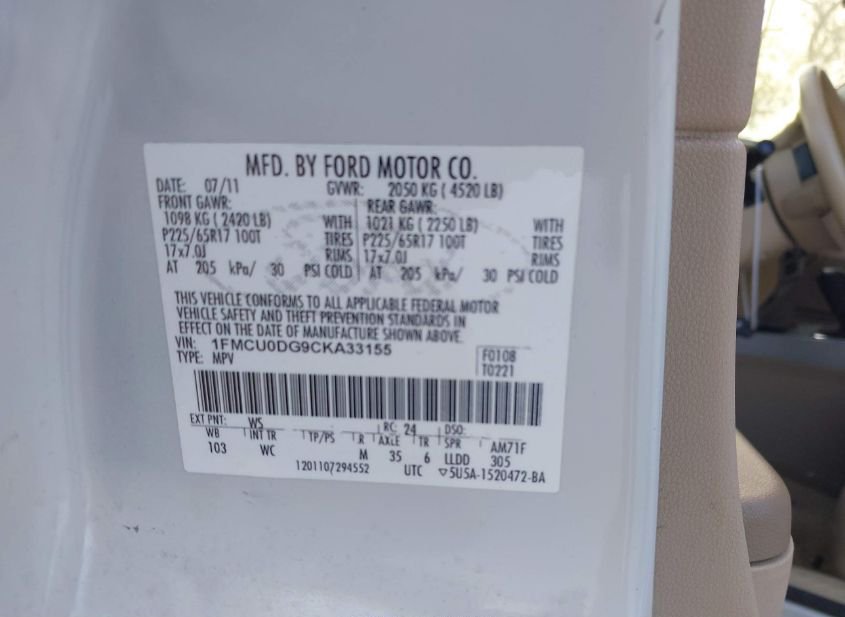 - VIN: 1FMCU0DG9CKA33155