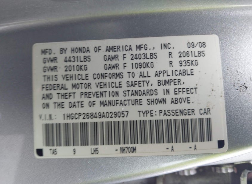 - VIN: 1HGCP26849A029057