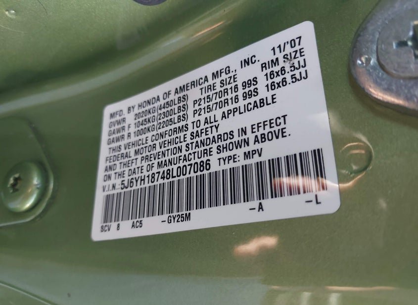 - VIN: 5J6YH18748L007086