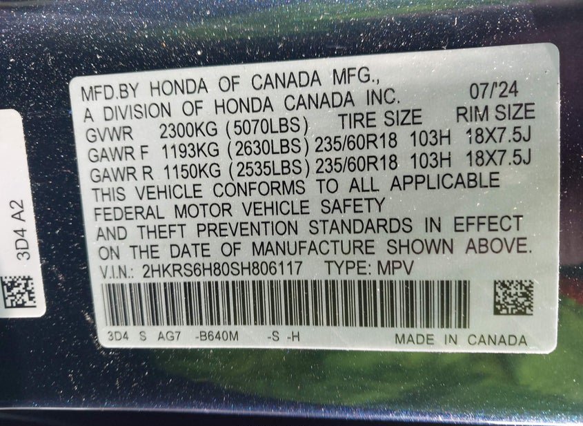 - VIN: 2HKRS6H80SH806117