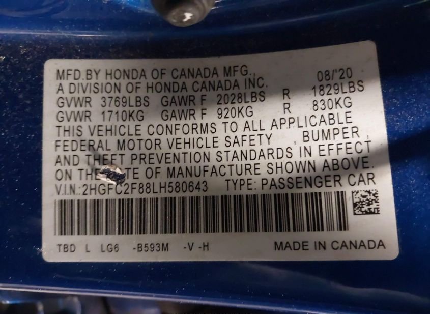 - VIN: 2HGFC2F88LH580643