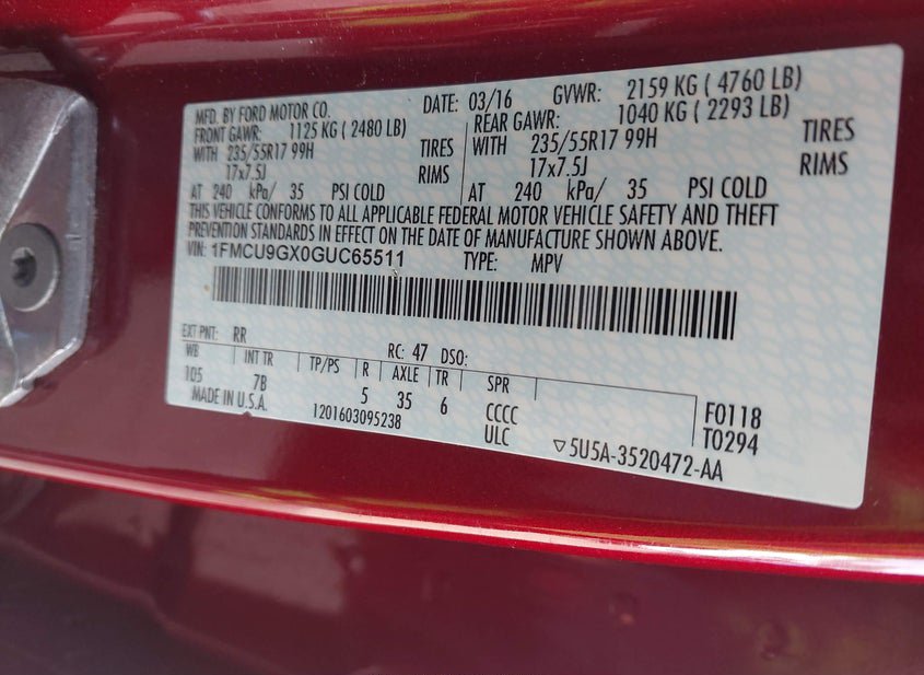 - VIN: 1FMCU9GX0GUC65511