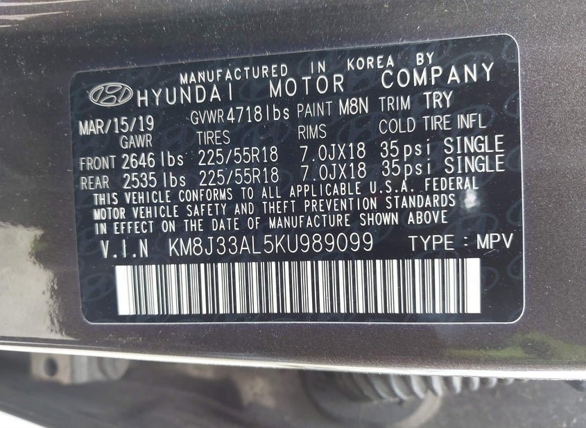 - VIN: KM8J33AL5KU989099
