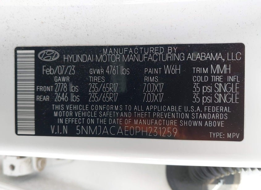 - VIN: 5NMJACAE0PH231259