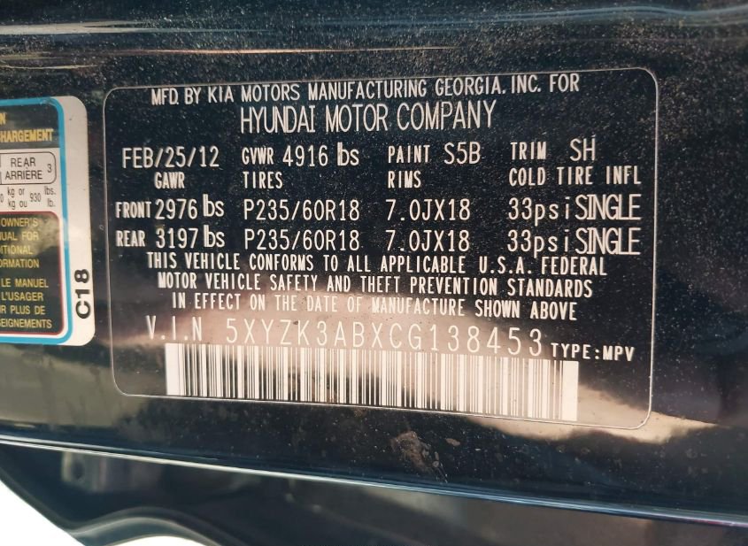 - VIN: 5XYZK3ABXCG138453