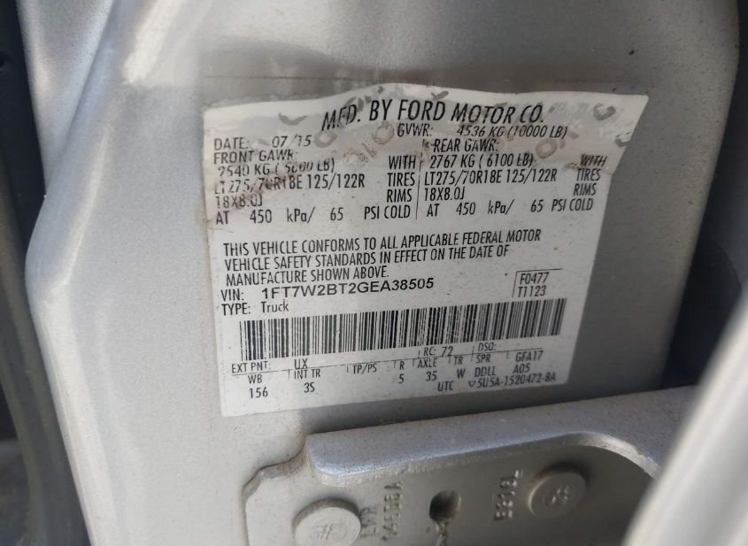 - VIN: 1FT7W2BT2GEA38505