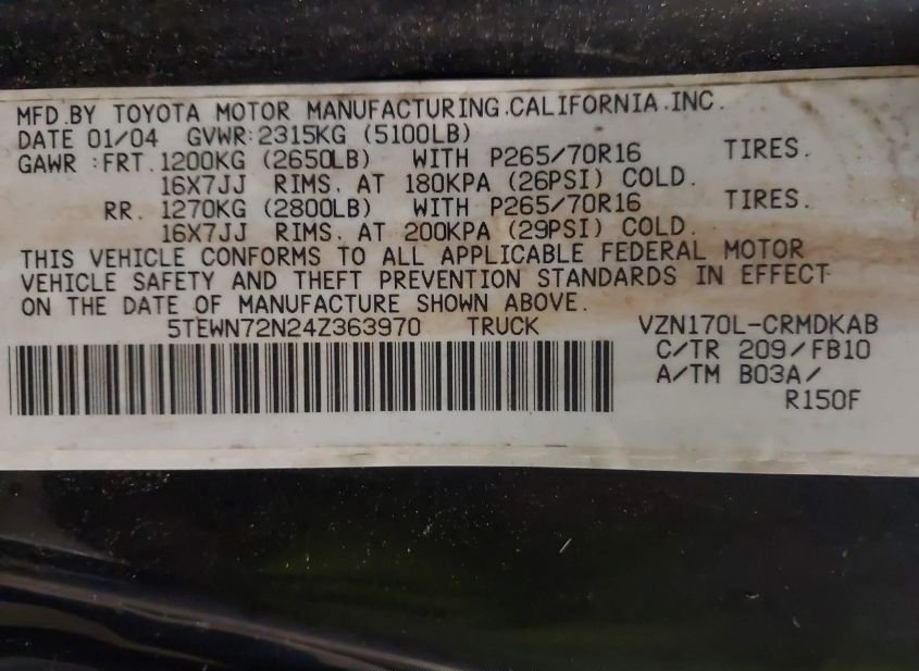 - VIN: 5TEWN72N24Z363970