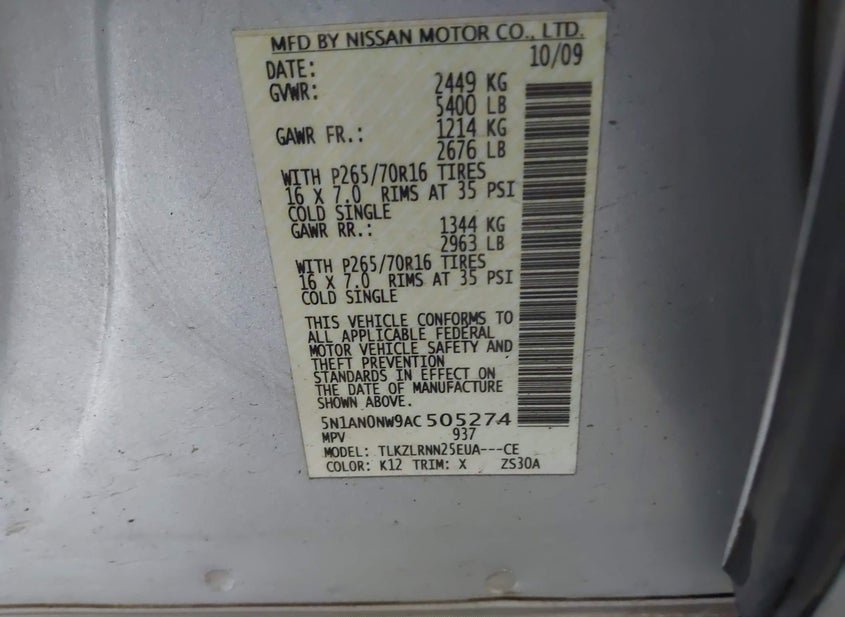 - VIN: 5N1AN0NW9AC505274