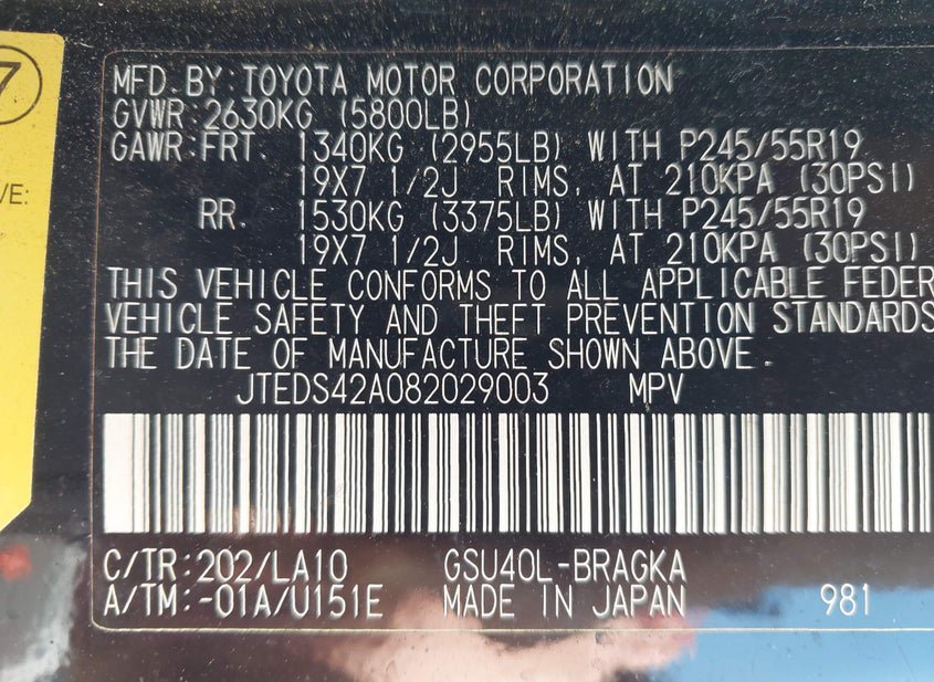 - VIN: JTEDS42A082029003